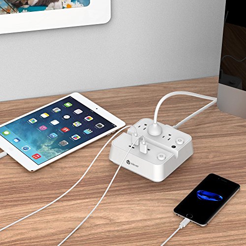 [Separate Switch Control] iClever BoostStrip IC-BS02 Smart Power Strip | USB Charger with 4 USB + 3 AC OutLets, Dual Switch Control Charging Station and Phone / Tablet Stand - White