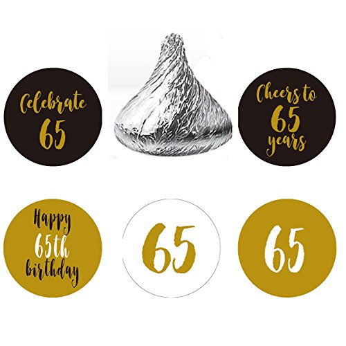 Gold Black 65th Birthday Party Favors Stickers, Round Candy Labels Fit Hershey’s Kisses, 200 Count