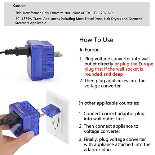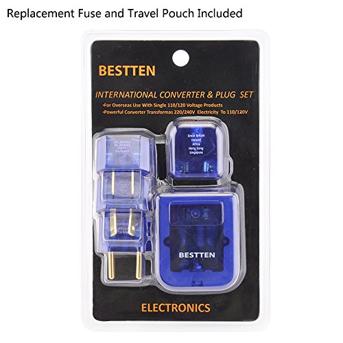Bestten 1875W Voltage Converter Transformer and Travel Plug Adapter Combo. Step Down 220v To 110v (UK, Europe, China, Austrilia, Middle East, South America, Japan, Caribbean, Africa to USA) 5pc Pack