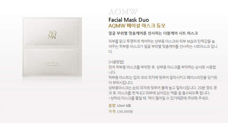 | 먼저 하부용 마스크를 부착한 후, 상부용 마스크를 부착하는 순서로 사용합니다. 하부용 마스트는 입과 코의 위치에 맞추어 밀착시키고 페이스라인을 당기듯이 부착시킵니다. 상부용마스크는 눈의 위치에 맞추어 볼에 놓고 밀착시킵니다. 10분 정도 경과 후, 마스크를 벗겨내고 피부에 남아있는 액을 잘 흡수되도록 합니다. *상하의 마스크를 펼칠 때, 액이 떨어질 수 있기때문에 주의해 주세요. |