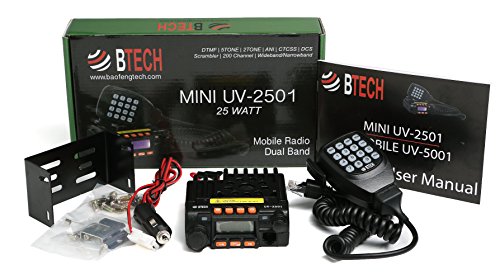 -. Feature : Scrambler/Inversion Chipset, DTMF, 5Tone, 2Tone, CTCSS, and DCS Calling Modes Supported (Remote Kill/Stun Supported) / High / Low Power Settings (25W/10W); Frequency Range: 65-108 MHz(Only commercial FM radio reception) VHF: 136-174 MHz(Rx/Tx). UHF: 400-520 MHz(Rx/Tx); Broad (Wide) / Narrowband (Narrow) Selectable / Recommended Accessories: Pair UV-2501 with the Nagoya UT-72 Magnetic Mount Antenna for easy installation. The PC04 FTDI Cable is recommended for easy computer programming / Dual Watch Delay Time Function: Allows the receiver to stay on the secondary channel longer after incoming transmission - customize the delay up to 50 seconds; This avoids manually channel switching when you are engaged with simulaneous contacts on two frequencies / Kit Includes: BTECH UV-2501, Speaker Mic, 6 foot DC Cable with Cigarette Plug Connector, Radio & Mic Brackets, Mounting Hardware, and User Guide