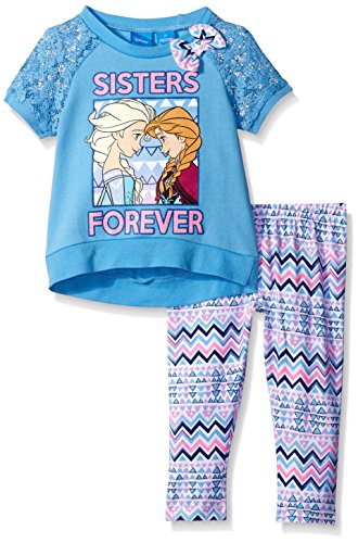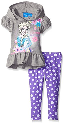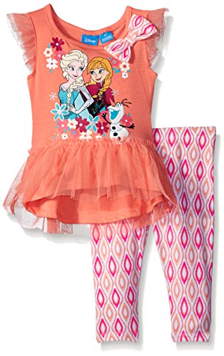 Frozen French terry top crochet sleeves and printed tack on bow legging set and frozen jersey tunic with tacked boy, tulle overlay and hi-lo ruffle legging set, frozen jersey hooded tunic set