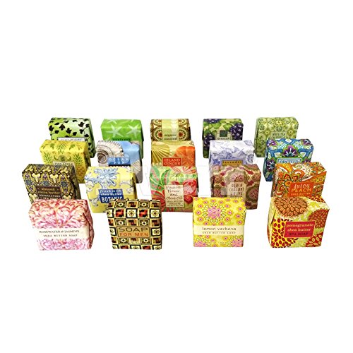 - Unique sampler with the following scents: Ocean Pur, Soap for Men, Lemon Verbena, White Tea Calendula, Black Currant, Lavender Chamomile, Orchid Jojoba, Pineapple Cocoa Butter, Passionflower Olive Oil, Island Ginger & Mango Butter, Fresh Milk, Cucumber, Juicy Peach, Pomegranate, Organic Oatmeal, Almond Cocoa Butter, African Violet, Rosewater & Jasmine and Seafresh Mineral. Can be used as a hand or body soap. Perfect travel sized soap as well.