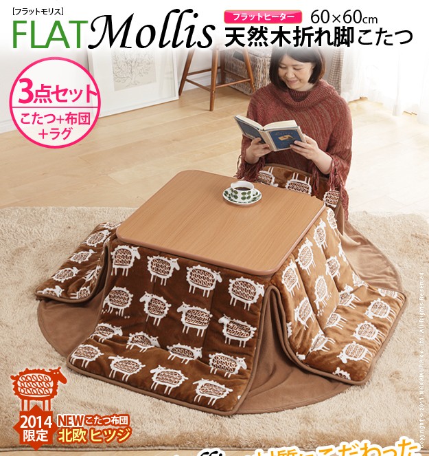こたつ フラットヒーター 正方形 天然 木製 折れ脚 リバーシブルこたつ フラットモリス 60x60cmこたつ+専用 省スペースこたつ布団 + ラグ 3点セット