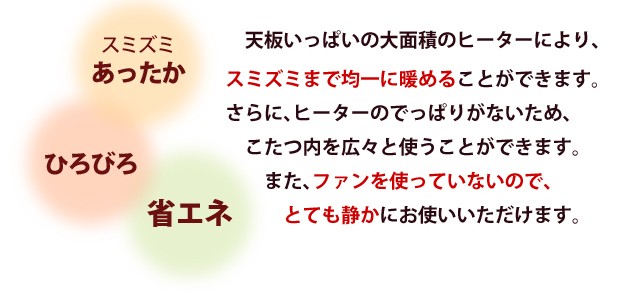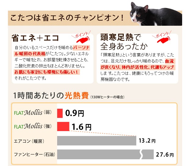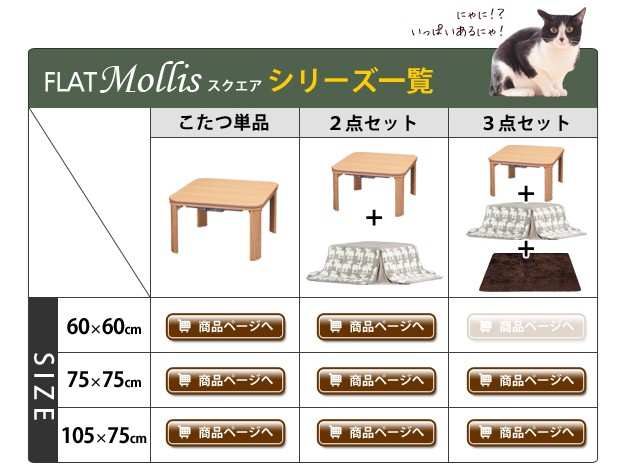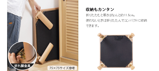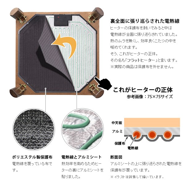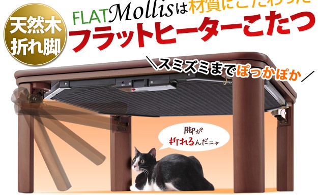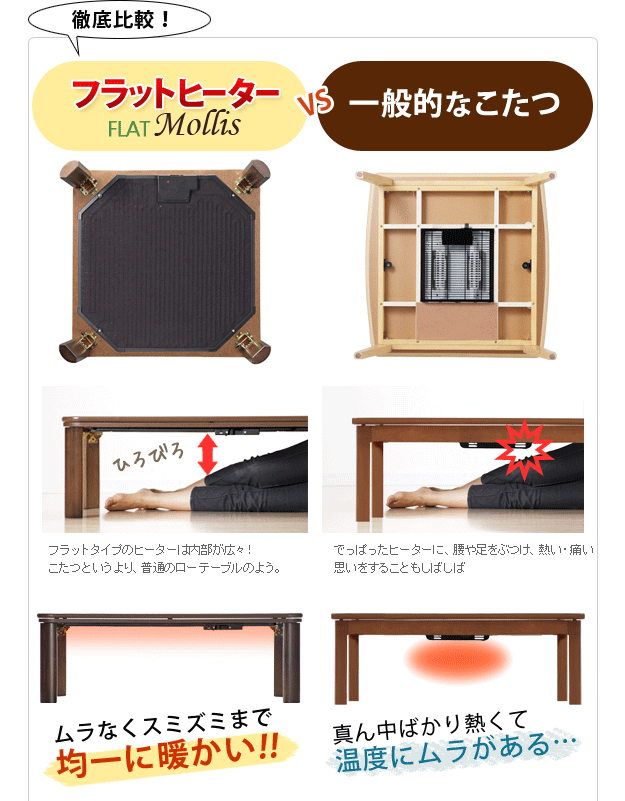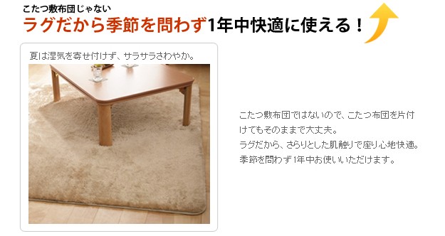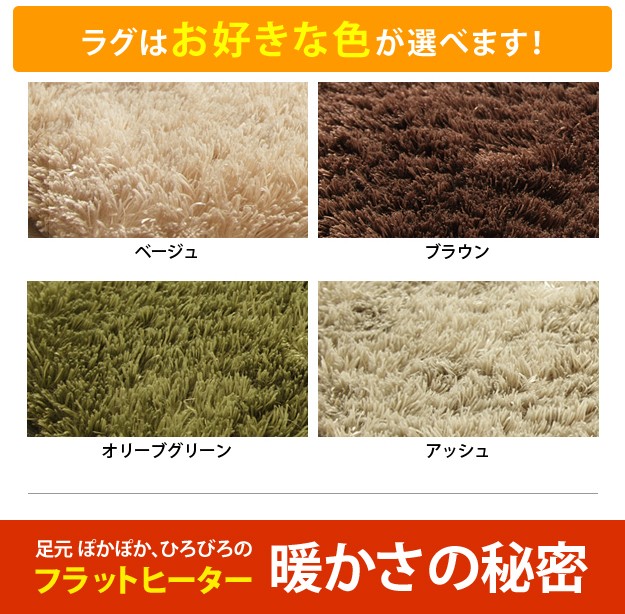 商品について:フラットヒーターこたつ+省スペース布団+ラグの3点セット。こたつは温度ムラがなく隅々まで暖まるフラットヒーター。出っ張りがないので内部は広々♪ヒーターを気にせず、1年を通してお使いいただけます。折りたたむと厚さ約11.5cm!コンパクトに収納できます。