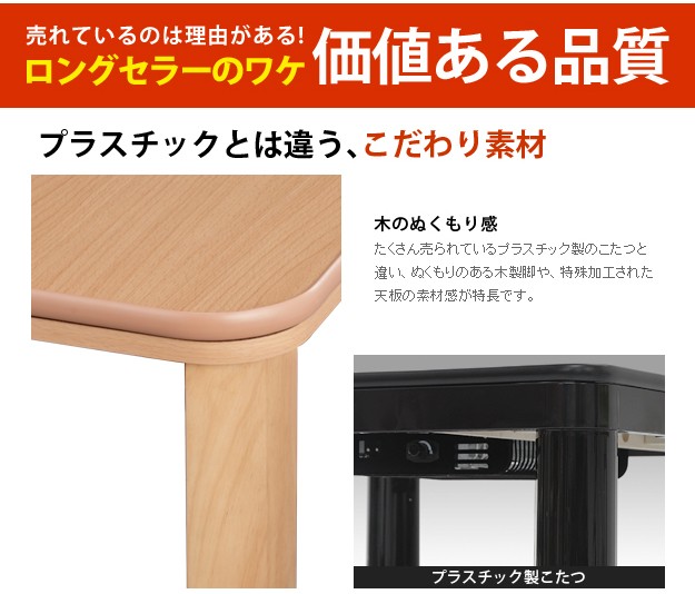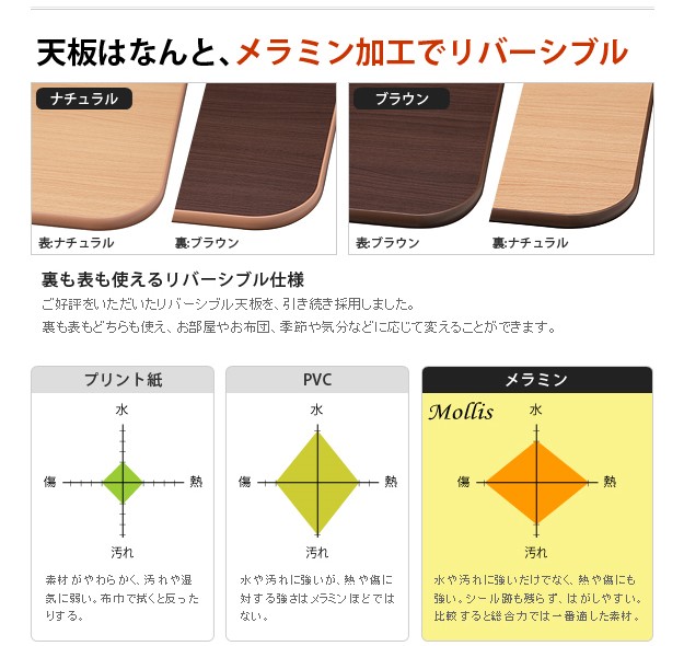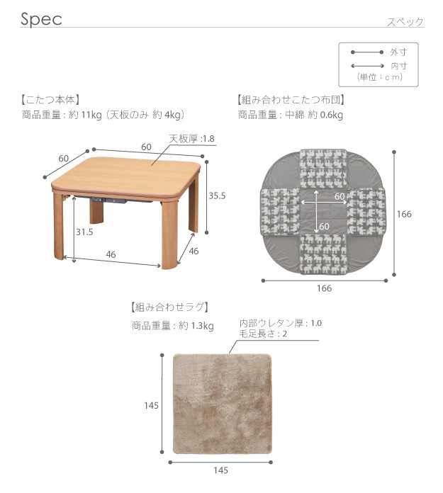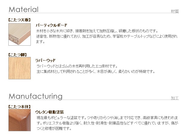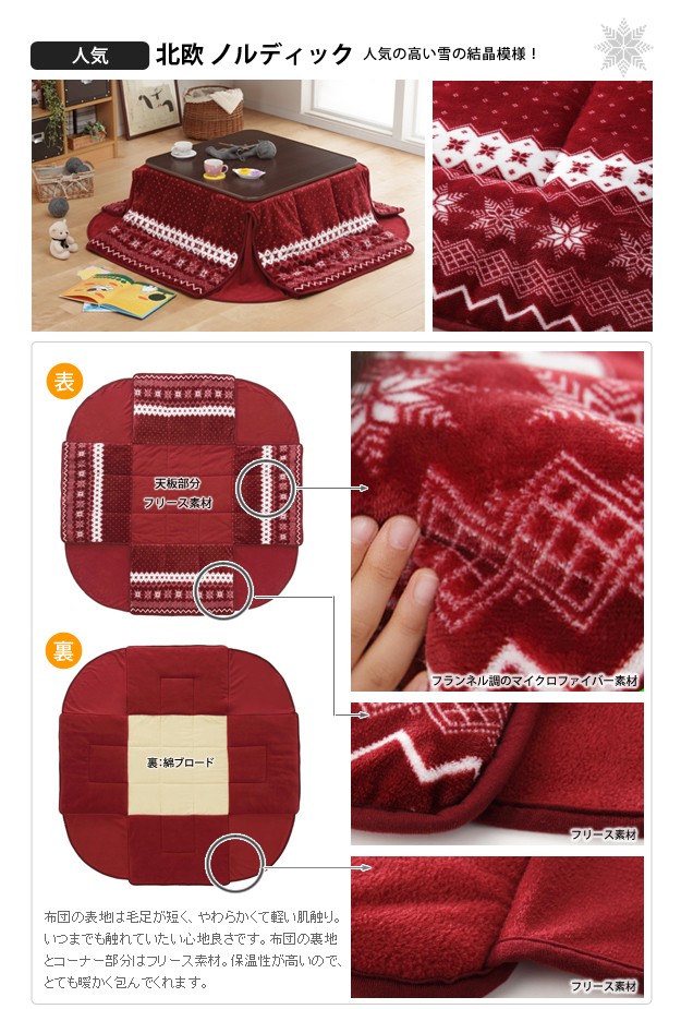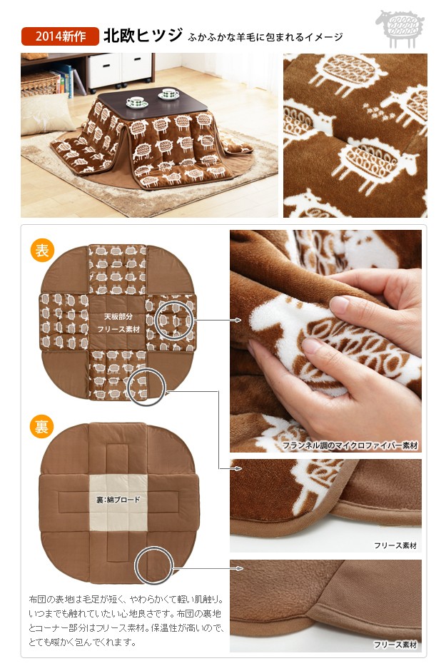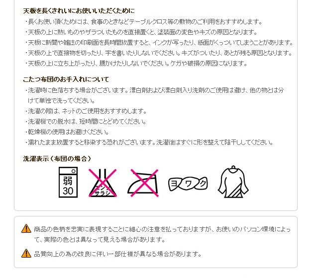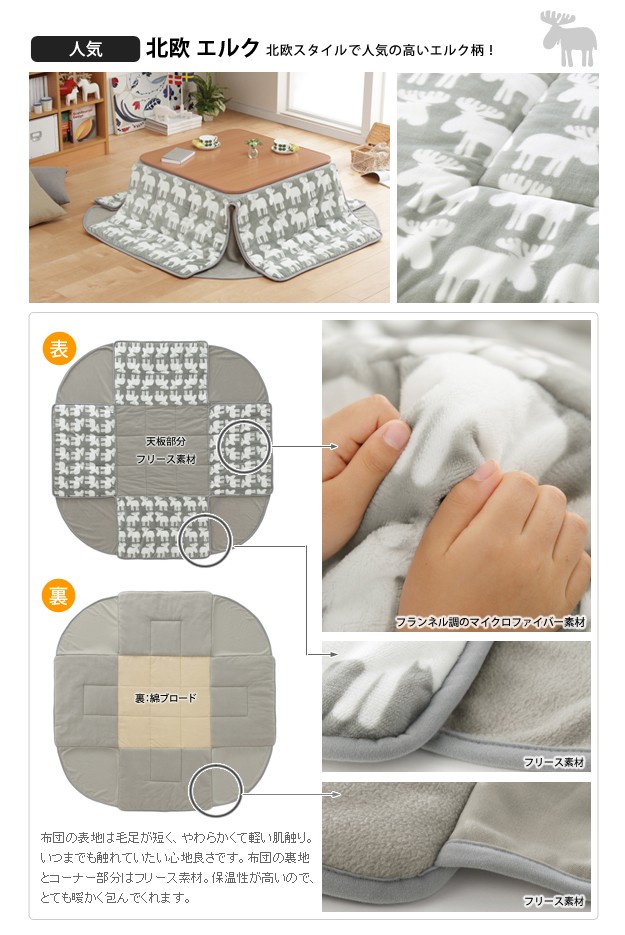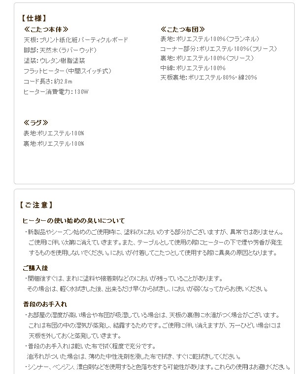 材質:天板-プリント紙化粧パーティクルボード、布団表地-ポリエステル100%(フランネル)、布団コーナー・裏地-ポリエステル100%(フリース)、ラグ表地・裏地-ポリエステル100%