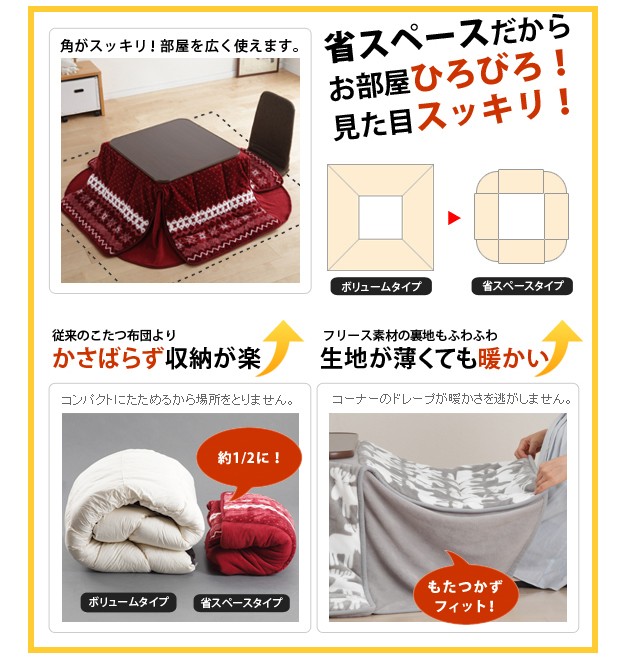 角のもたつきを解消した省スペースタイプの布団は圧迫感のないスッキリとした印象☆裏地とコーナー部分は保温性の高いフリース素材です。