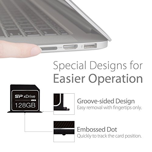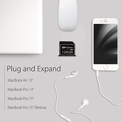 Plug and Expand. Instant Storage Expansion Solution for Your MacBook. SP xDrive L13 memory card is especially designed for Apple users to instantly get more storage space for MacBook Air and MacBook Pro. With large capacity of 128GB, the L13 is able to store 48,000 8-Megapixel photos, 33,000 MP3 songs or 28 hours of Full HD (9Mbps) videos. Ultra-fast Data Transfer Rates SP xDrive L13 runs at amazingly-fast transfer speeds up to Read/Write 90/60 MB/s to unleash the power of MacBook without any interruption. Now, all the delays are out of picture no matter you are processing graphic editing or dealing with large media files backups. Easier Operation with Embossed Dot and Groove-sided Design The exclusive embossed dot is set for you to quickly track the position of card slot, and the special groove-sided design is made for easy removal with fingertips only. Lifetime Warranty SP xDrive L13 is backed by a lifetime warranty that guarantees complete services and technical support. * Please register your product via SP official website to get the complete manufacturer warranty services, product support and more. Box Contains 1 x Silicon Power SP xDrive L13 Expansion CardFeature