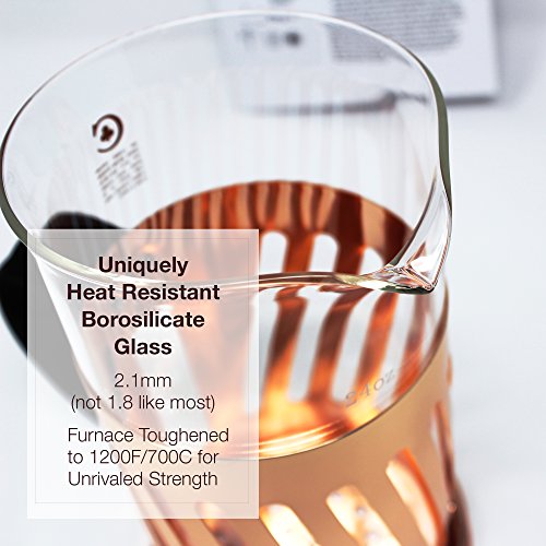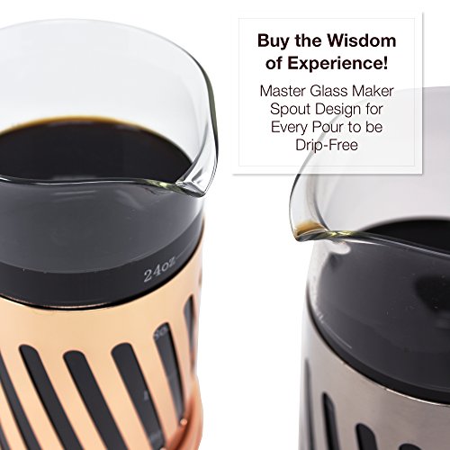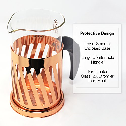 LEVEL BASE & CAGED SNUG CARAFE FOR EASY USE! TURN TO PRESS/POUR SLOTS PREVENT SPOUTING. INSULATED TOP STOPS RUST & Prevents Burns. Heavy .5mm Stainless Steel Frame Plated with Rose Gold Hue of Copper and Food Grade BPA Free #5 Plastic Where it Matters. Over 2000 Sold Earning Amazon Top Ratings "... it's absolutely gorgeous ... a dream to use. Love it ... Would Buy it Again."
