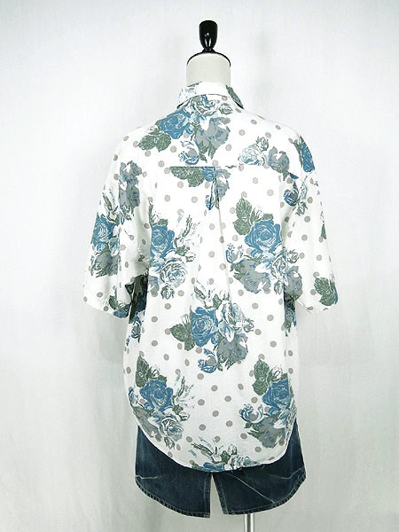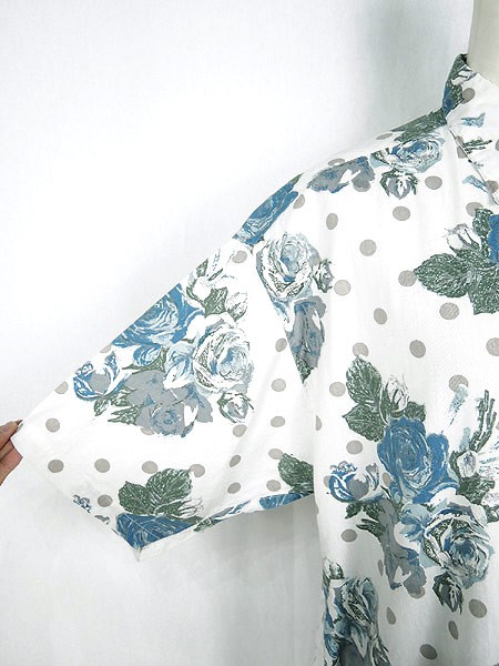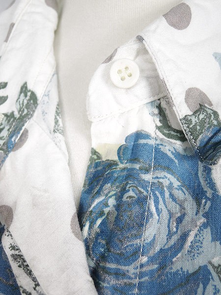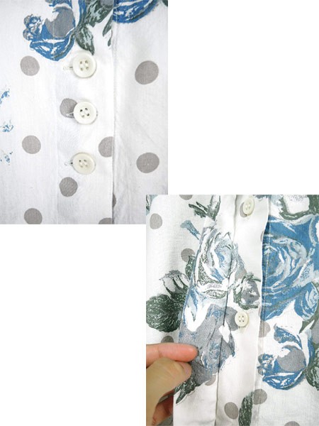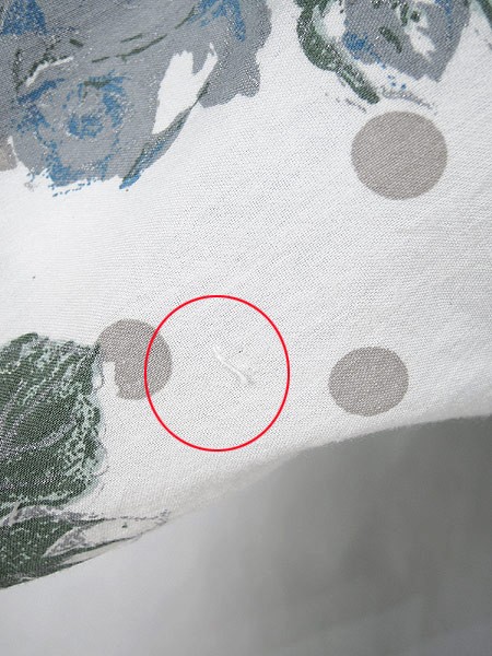 Ladies ブランド- カラー白ベース・青・グレー メール便不可 コンディション★★★ 素材コットン・レーヨン 表記サイズM スタッフコメント前立て、首下付近にヨゴレあり。裏地、肩部分にマジックテープが付いています。 実寸サイズ 着丈 65 cm 身幅 53 cm 肩幅 50 cm 袖丈 25 cm ※ウエスト・ヒップ以外は平置き採寸