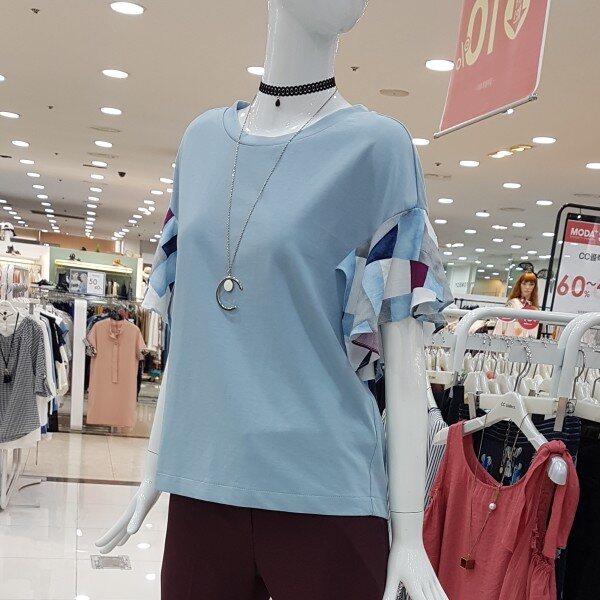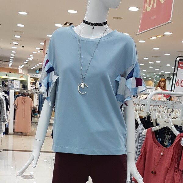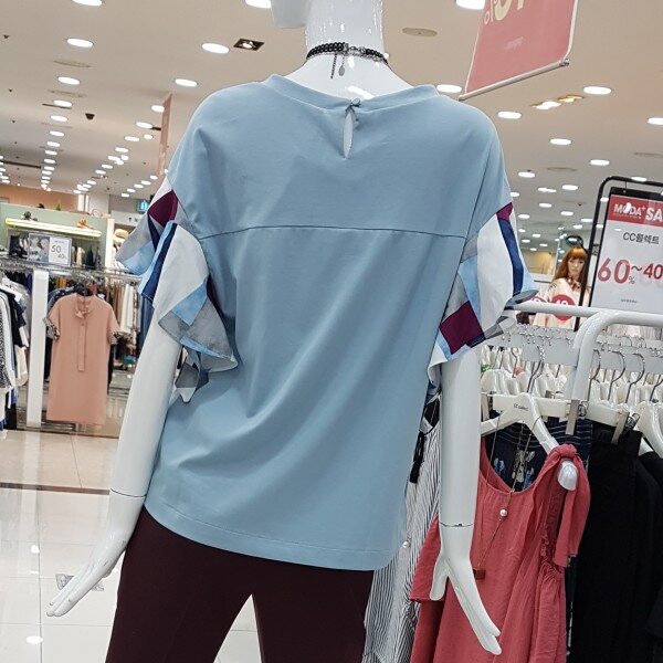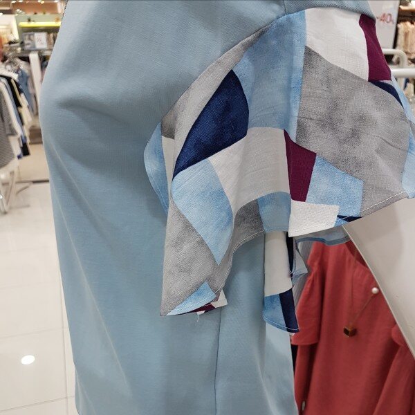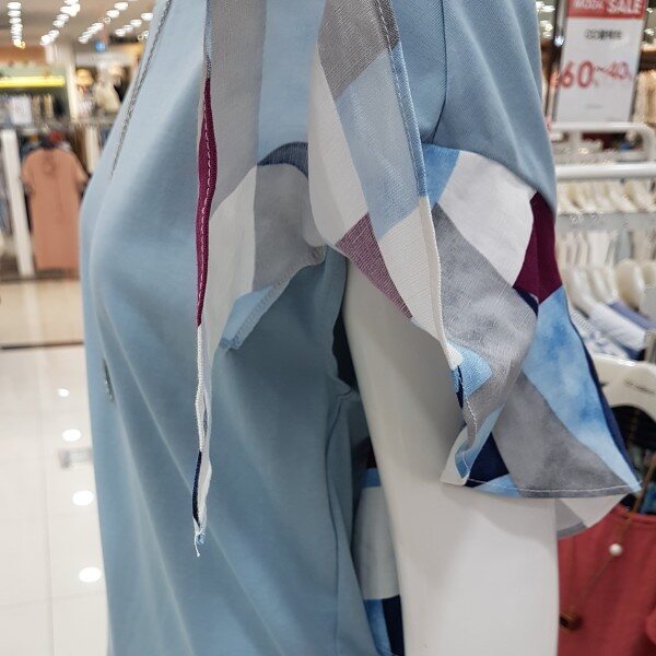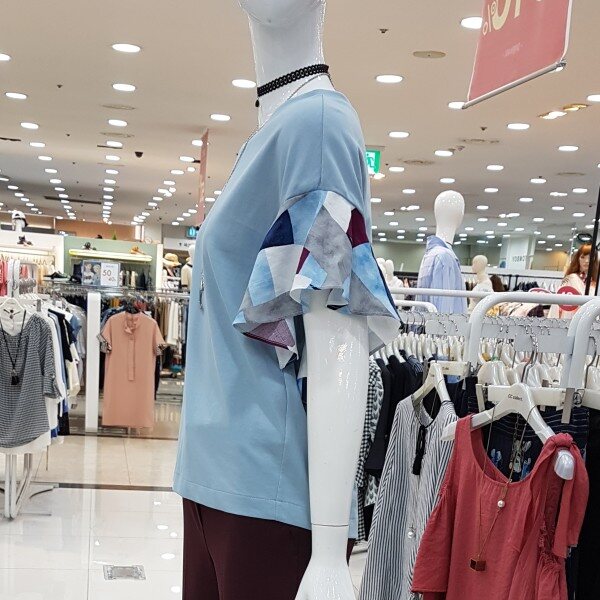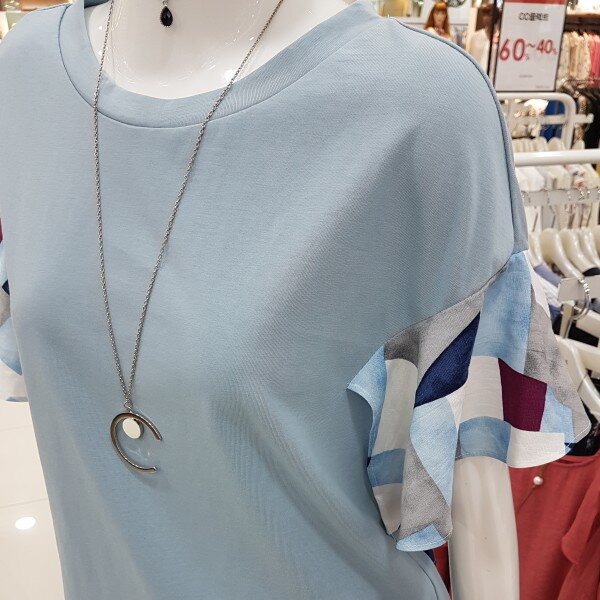 블라우스처럼 팔랑소매단에 티셔츠네요기하학문양에 배색컬러도 넘~세련하구요보들소재에 촉감도 좋아용^^여유있는 사이즈에 착용감 편하구요캐쥬얼,세미정장으로 코디굿~하네요