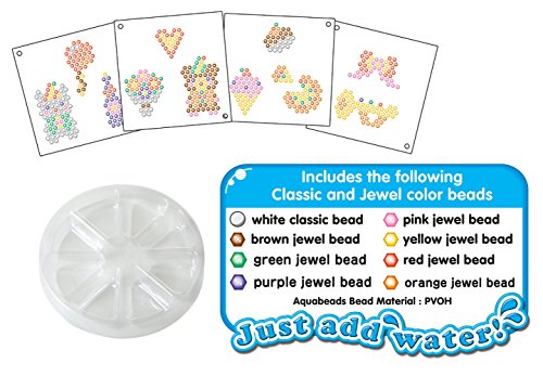 Create a cute bear, pizza pie, trumpet and much more! This Theme Refill can be used with any Aqua beads Playset. Select a design template, place layout tray over template and create your design. When done, spray with water and the beads will magically stick together. This set contains over 600 jewel beads in 8 colors, 4 design templates, and instructions. Does not include layout tray, bead pen or sprayer.Feature