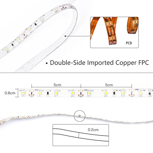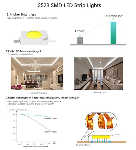 - Professional lighting : Use Double layer copper circuit board, copper LED frame, Epoxy cover and SMD 3528, Better heat dissipation performance, more durable and stylish, keeps the LED strip brighter and longer life, The Lifespan is over 50000 hours