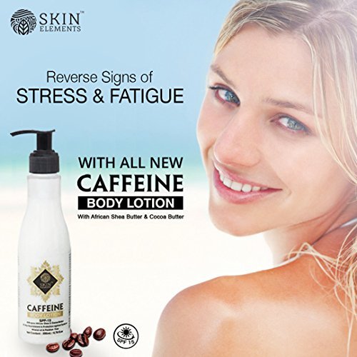 A hectic work schedule often takes a toll on your skin; leaving it dull, tired and lifeless at the end of the day. Skin Elements Caffeine Moisturising Body Lotion helps reverse these signs of stress and fatigue. It leaves your skin feeling fresh and rejuvenated, with a long-lasting, all-day effect.Moisturised with pure African Shea & Cocoa Butter, this super creamy lotion replenishes and softens the skin, leaving it with a healthy radiant glow all day.