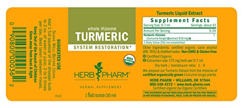 Herb Pharm’s turmeric is expertly crafted from hand-harvested and fully mature rhizome of certified organic Curcuma longa plants. Turmeric extract is easily dosed and may be added to water or other liquid for taste or taken directly in the mouth. Herb Pharm liquid extracts are easily absorbed into the bloodstream. Turmeric is spicy, rich, and rooty - users are encouraged to embrace the taste. Turmeric is extracted in organic cane alcohol to deliver a full spectrum of phytochemicals. Softgels are produced using beeswax and are vegetarian, but not vegan. The inclusion of certified organic Black pepper in the soft gels aids the body's utilization of Turmeric's full potency - purity and safety are assured through natural extraction with water and supercritical CO2. Herb Pharm never uses synthetic solvents. The company's farm is Certified Organic, Bee Friendly, and Salmon Safe. Herb Pharm is the #1 selling liquid herbal extract brand in US Natural Food (SPINS). Herb Pharm's promise is to make plant products in their most undistorted and efficacious forms while being an advocate for community and environmental values. Herb Pharm is a company of herbalists, scientists, and farmers in GMO-free Josephine County, OR. It’s where they have been cultivating herbs with care, precision, and respect for nature since 1979.Feature