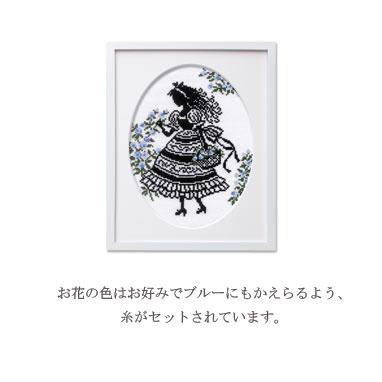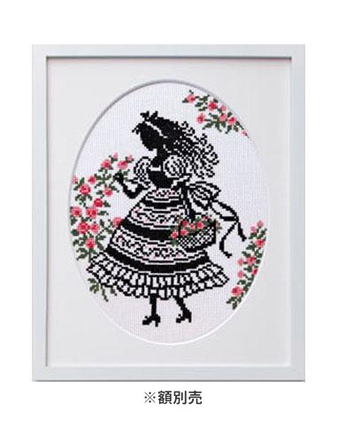 | 可憐な少女のシルエットと小花が可愛らしいキット。お花の色はお好みでブルーにもかえられるよう、糸がセットせれています。技法はクロスステッチ。額(W-53)は別売り。技術レベルは初級~中級者向。 |