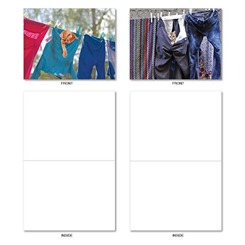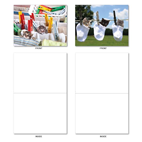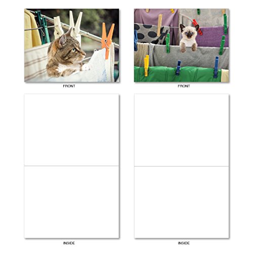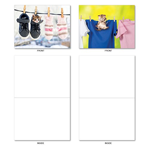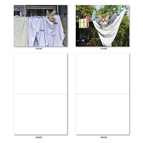 M6474OCB Hang In There: 10 Assorted Blank All-Occasion Note Cards Featuring Adorable Cats and Kittens Playing in Freshly Laundered Apparel Hanging From Clotheslines, w/White Envelopes.