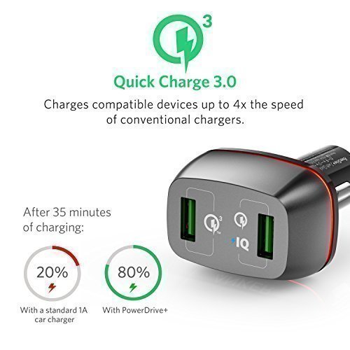 Fast-Charging Technology PowerDrive+ 2 provides possibly the fastest possible charge to any phone or tablet. Quick Charge 3.0 in one port charges compatible devices up to 80% in just 35 minutes. The port is powered by Quick Charge 2.0, couple with Anker's smart-charging PowerIQ.