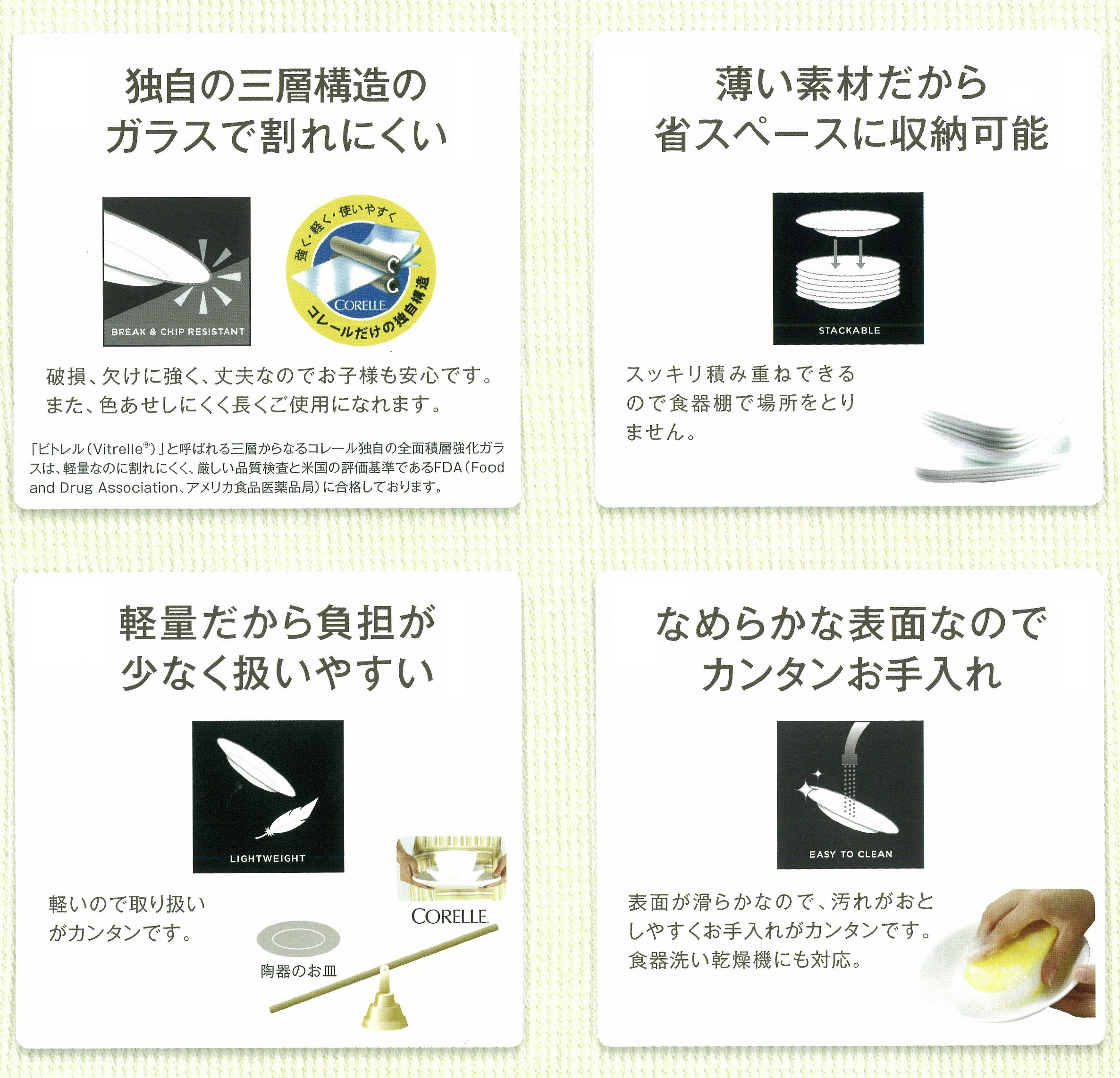 ● Correl is made of three layers of laminated glass.
