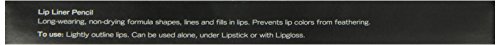 -. Feature : Moisturizing and defining lipliner / Provides defined shape / Enhances lip color / Long-lasting formula / Non-comedogenic