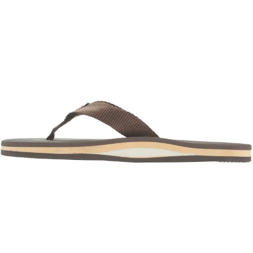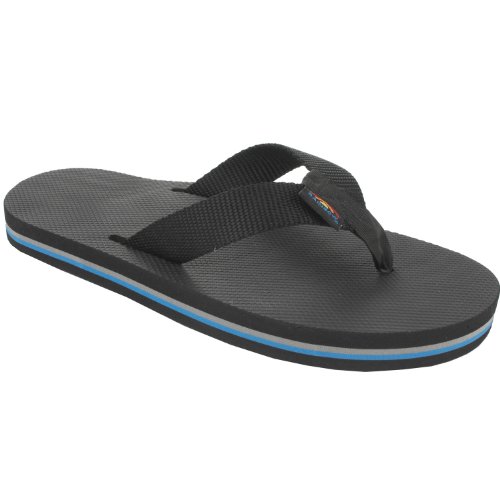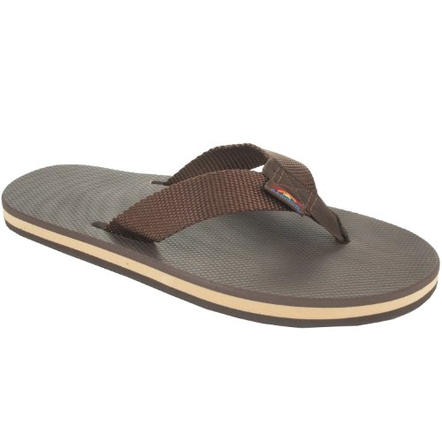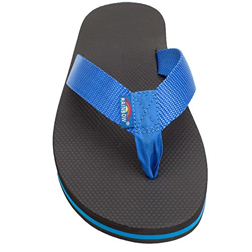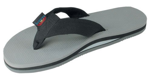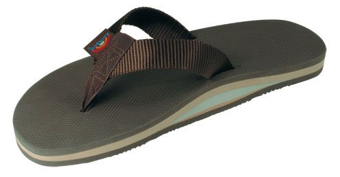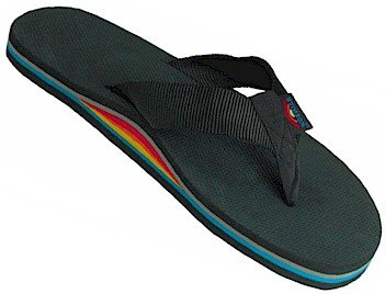 The Classic is an oldie but definitely a goodie! This single layer classic rubber sandal comes with a durable nylon strap and our non-slip Rainbow bottom. They don't make them like this anymore, but we still do! The Classic Rubber sandal was made for the waterman, single layer arch closed cell rubber that has a textured top sole so you won't slip when you're hosing off the boat, the non-slip bottom sole is perfect for work and play! The nylon strap and toe piece are sewn together with a box X stitch using durable bonded nylon thread. All the best materials are use so the thread won't fray or pull out. The layers are all triple glued and they are finished off with the Original Rainbow woven label.