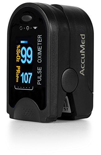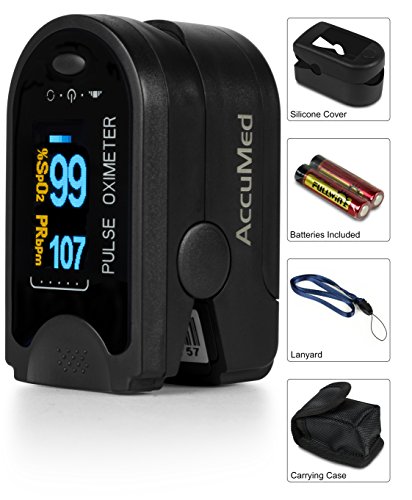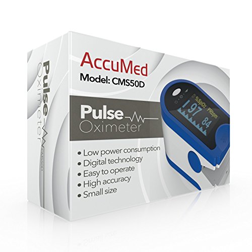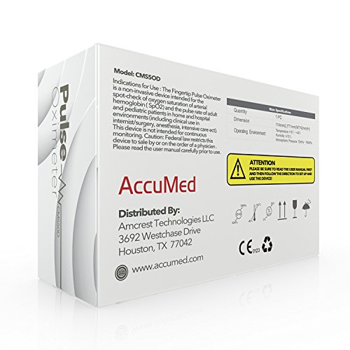 -. Binding : Misc. -. Brand : AccuMed -. Color : Black -. EAN : 0641378487293 -. Feature : AccuMed's digital LED display with low power consumption plus auto-power off feature allows for 40 continuous hours of battery life. / Cover against ambient light offers superior ease of reading. Fast and accurate SpO2 and pulse measurements. / Accommodates pediatric to adult finger sizes and can be used by sports and exercise enthusiasts as well as anyone interested in measuring pulse rate and oxygen saturation. / Includes 2 AAA batteries, lanyard, and convenient carrying case. / Guaranteed by 1 US year warranty offered exclusively by AccuMed. -. IsAutographed : 0 -. IsMemorabilia : 0 -. Label : AccuMed -. Manufacturer : AccuMed -. MPN : ACCMS50D-Black -. PackageQuantity : 1 -. PartNumber : ACCMS50D-Black -. ProductGroup : Sports -. ProductTypeName : SPORTING_GOODS -. Publisher : AccuMed -. Size : CMS-50D -. Studio : AccuMed -. Title : AccuMed® CMS-50D Pulse Oximeter Finger Pulse Blood Oxygen SpO2 Monitor w/ Carrying case, Landyard Silicon Case & Battery (Black) -. UPC : 641378487293