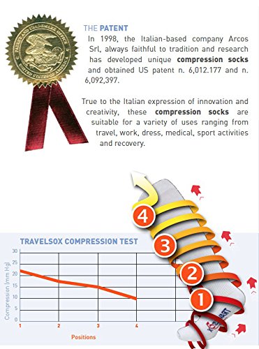 - Feature : Engineered with Coolmax to keep your feet dry and comfortable all day long / TravelSox graduated compression socks are specifically designed for travel. / They were developed in Italy using a patented design that helps stimulate blood flow reducing swelling while in close or cramped quarters for extended / The technical construction enables a gradual compression allowing increased circulation. / Arcos has created a fashionable Italian high-quality compression sock with a patented design that gradually stimulates the blood flow, improves circulation.
