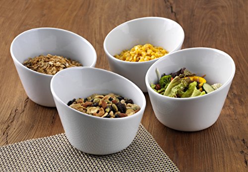 This set of 4 White Angled Serving Bowls from Gourmet Basics by MIkasa is the ultimate in modern dinnerware design and sets a tone of elegant sophistication at all your dinner gatherings. These bowls are made of pure white porcelain with a unique angled rim and a deep interior, making for an incredibly appetizing presentation on your table. Each bowl measures 7-3/4 Inch in diameter and holds 50 ounces. Set of 4. Microwave and dishwasher safe.Feature