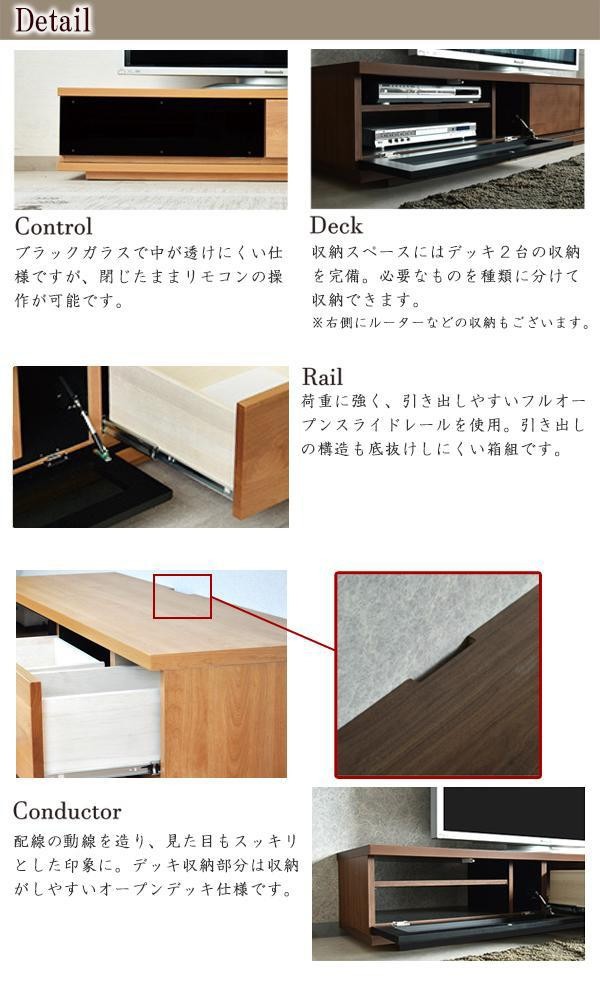 | 天然杢(アルダー材)を使用したテレビボード。収納スペースは、デッキ2台に加えルーターなどを置けるコンパクトなスペースを完備。デッキ収納背面部は、オープンになっており配線しやすくなっております。 |