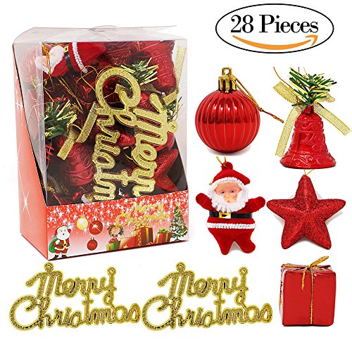 28 PACK CHRISTMAS ORNAMENTS: 28 pieces of Christmas tree decoration ornaments in a variety of shapes and designs. 6pcs bell models, 6pcs star models, 6pcs ball models, 4pcs Santa models, 4pcs gift box models, 2pcs Christmas cards.