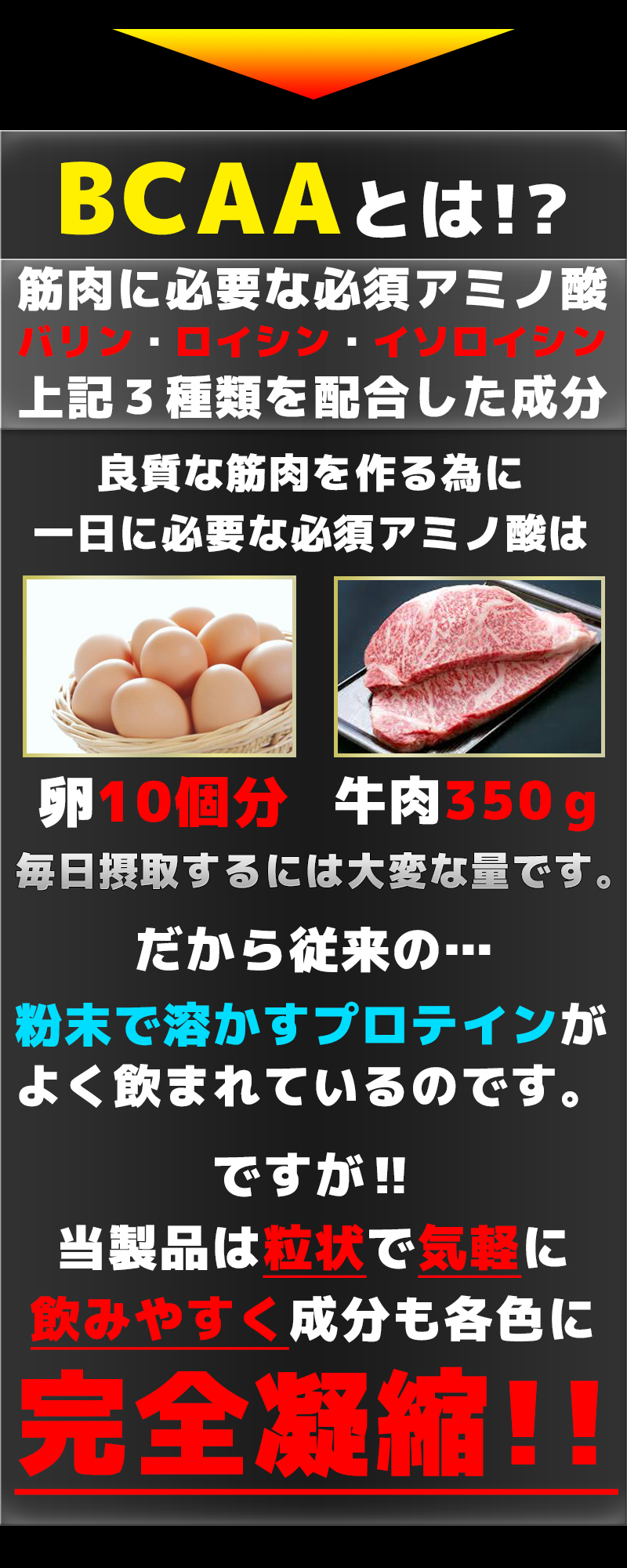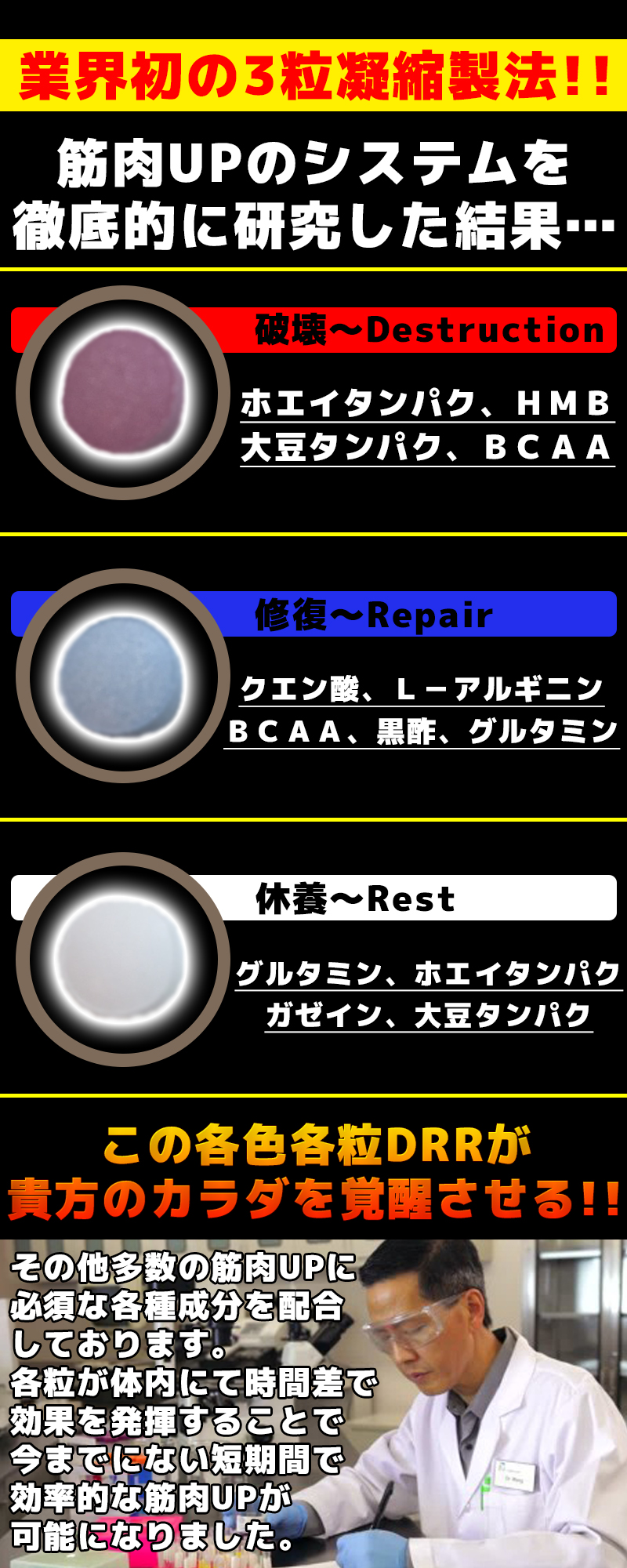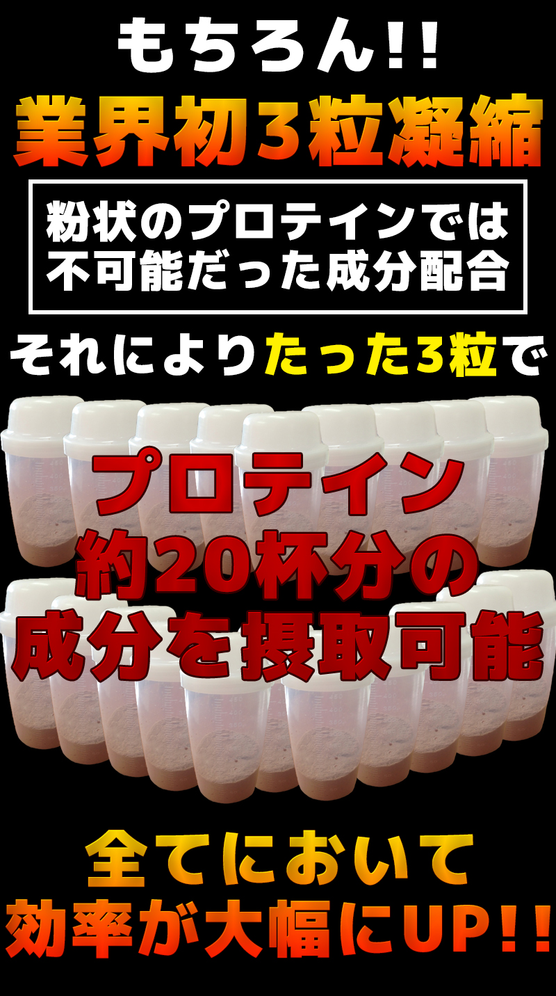 | 原材料名 | 【赤粒】ホエイタンパク、大豆タンパク、L-シトルリン/セルロース、ショ糖脂肪酸エステル、微粒二酸化ケイ素、HMB-Ca、野菜色素、L-バリン、L-ロイシン、L-イソロイシン ※原料の一部に乳を含む 【青粒】L-シトルリン、黒酢末/セルロース、ショ糖脂肪酸エステル、微粒二酸化ケイ素、L-アルギニン、グルタミン酸、クエン酸、スピルリナ色素、L-バリン、L-ロイシン、L-イソロイシン 【白粒】大豆タンパク、ホエイタンパク、カゼインホスホペプチド(乳成分を含む)/セルロース、ショ糖脂肪酸エステル、微粒二酸化ケイ素、L-グルタミン ※原料の一部に乳を含む |