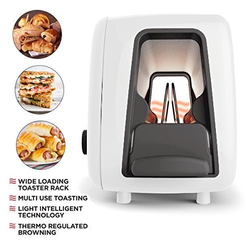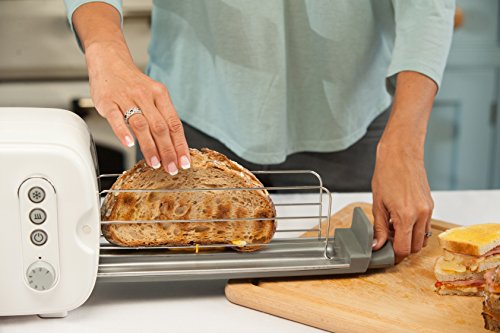 SIDE LOADING: Revolutionary design. Side load design allows you to heat things too big for a toaster TOAST EVERYTHING: Big thick pieces of bread, bagels, waffles and anything too big to fit in toaster. HEAT LUNCH: Toast and cook whole sandwiches, paninis and pitas. Re-Heat leftover pizza. STILL THE SIZE OF A TOASTER: All the uses of a toaster oven but half the size. Fits on the counter. EASY TO CLEAN: Just pull out the tray, rinse and wipe and it is clean again. Non-stick.Feature