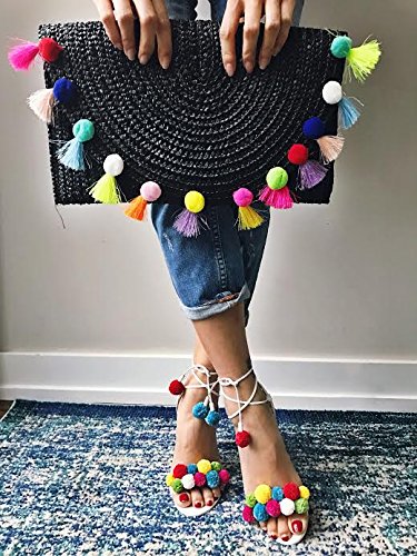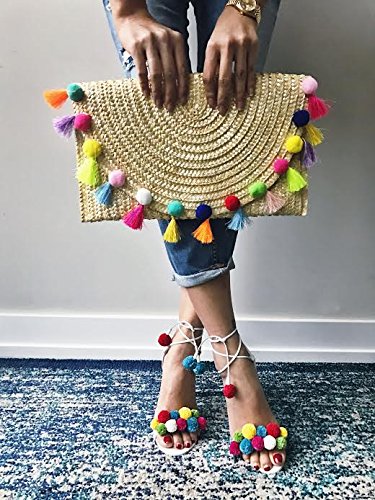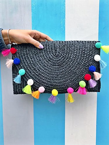 -. Title : Straw Pom Pom and Tassel Clutch - Colorful Summer Bag