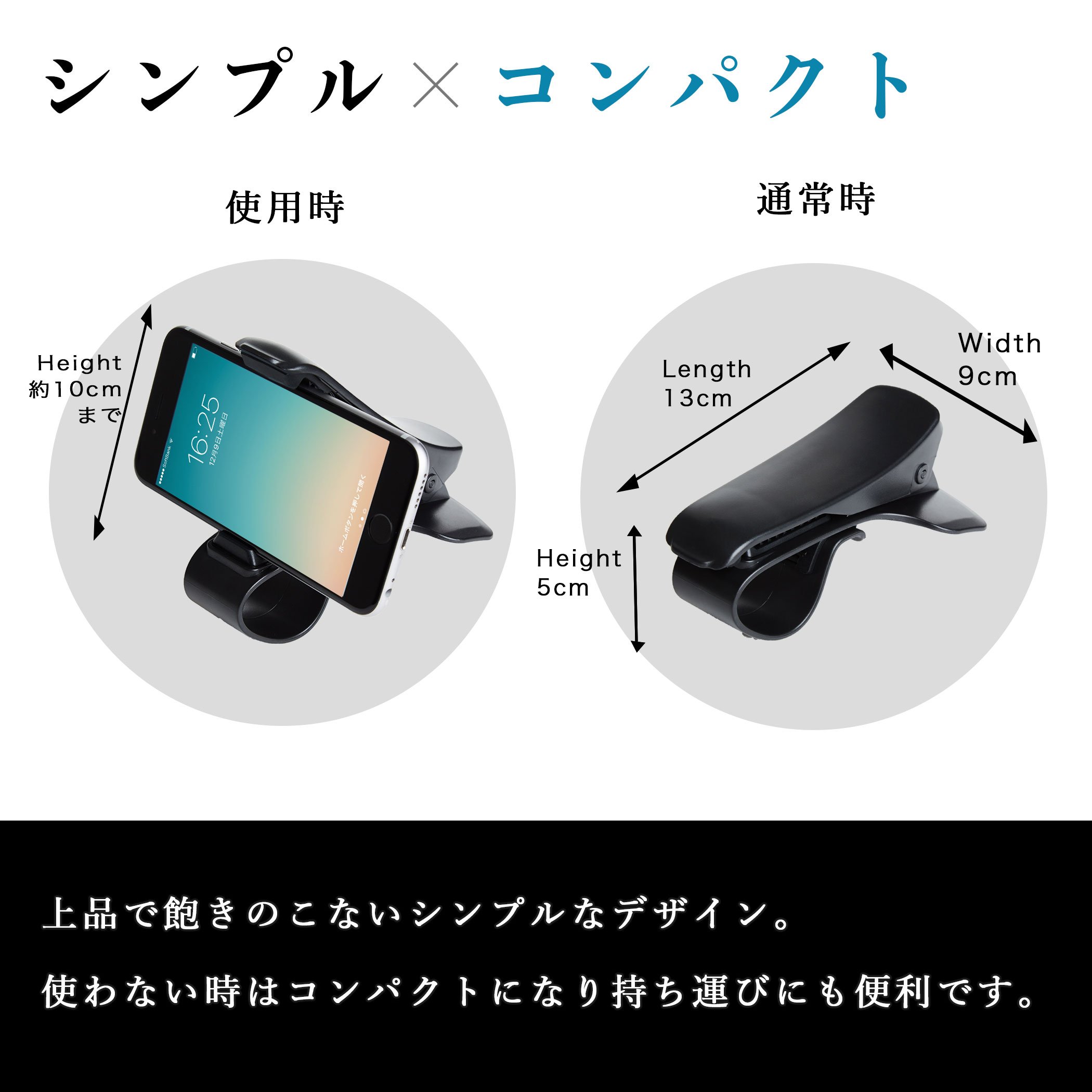 Normal time: Width 9 cm Length 13 cm Height 5 cm When used: Height Approximately 13 cm (Depending on the size of the smartphone.) When not in use, it fits compactly.
