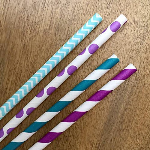 Charmed Mermaid theme Purple, blue and teal paper straw in polka dot, chevron, and stripe design 100 Pack