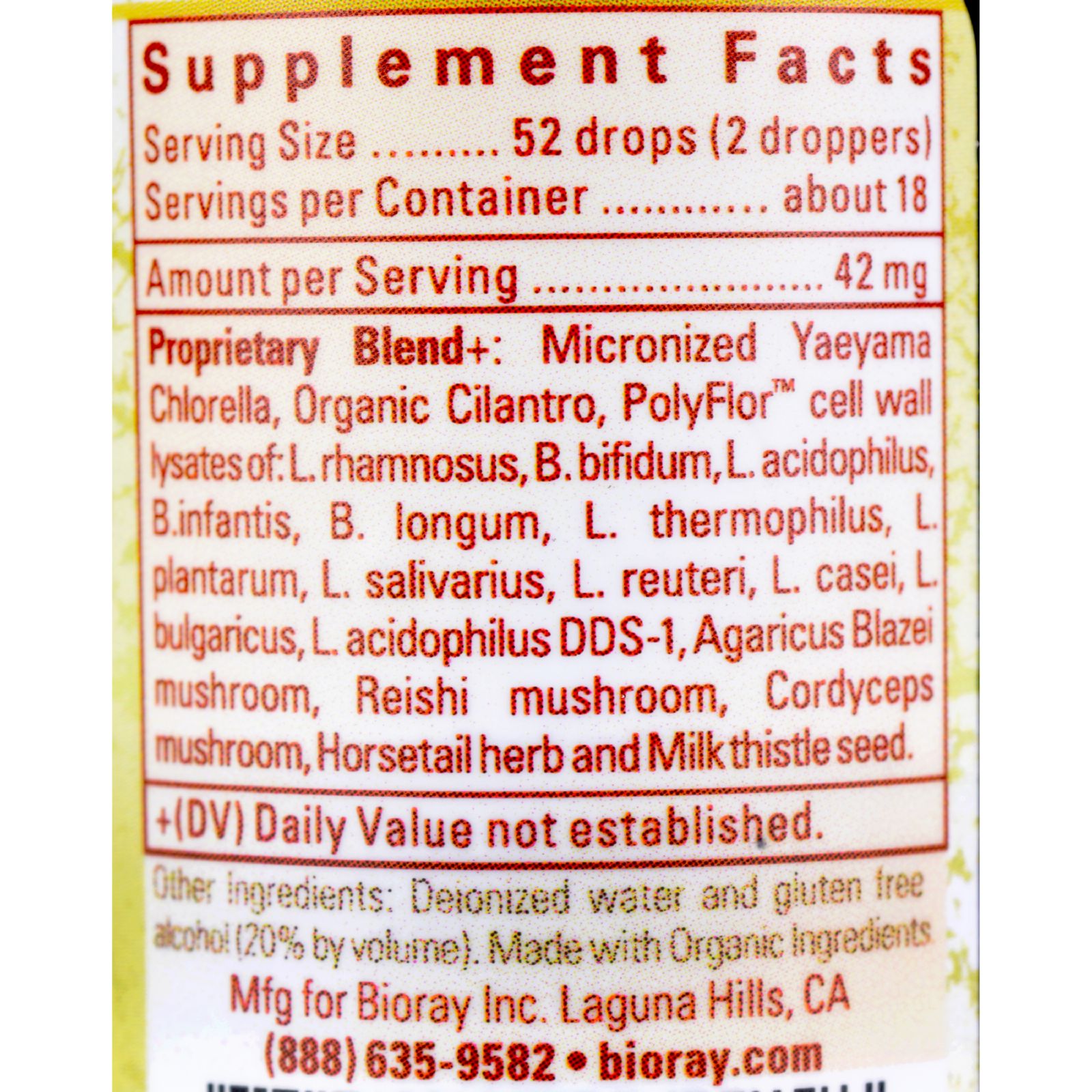 | Supplement Facts | | Serving Size: 26 drops or 1 dropper | | Servings Per Container: 30 | | | Amount per Serving | % Daily Value | Proprietary Blend Micronized Yaeyama Chlorella, Certified Organic Cilantro, PolyFlor cell wall lysates of: L. rhamnosus, B. bifidum, L. acidophilus, B. infantis, B. longum, S. thermophilus, L. plantarum, L. salivarius, L. reuteri, L. casei, L. bulgaricus, Agaricus Blazei Mushroom, Reishi Mushroom, Cordyceps Mushroom, Horsetail Herb and Milk Thistle Seeds | .8 g | + | | + (DV) Daily Value not established. | |