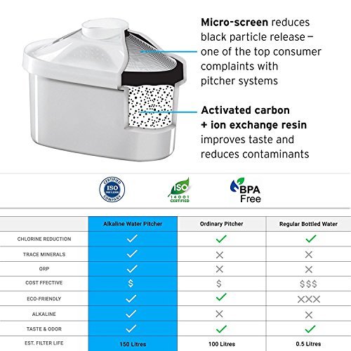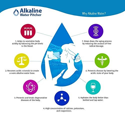 🌿 ECONOMICAL & ENVIRONMENTALLY FRIENDLY; Eliminates need for plastic bottles; Our ph water filters are made with BPA free food grade ABS material; Our unique design slim pitcher easily fits in any refrigerator; Easy-to-fill lid designed to allow you to fill the reservoir without removing the cover; Easy pour spout ensures the perfect pour with no mess and our sturdy, ergonomic handle ensures comfort during every use.