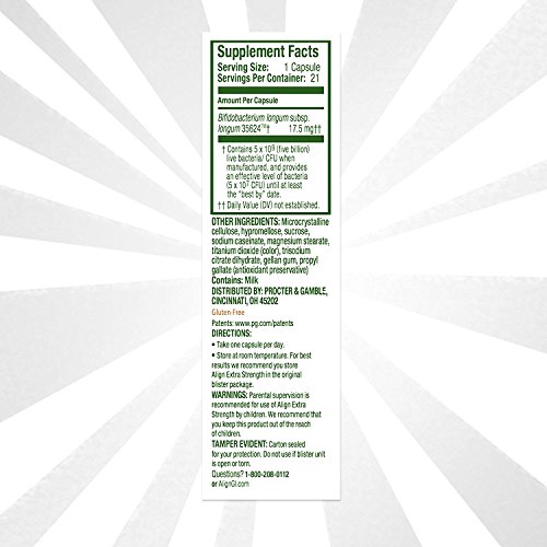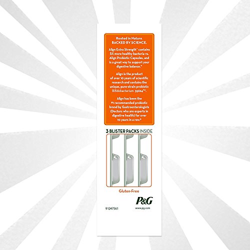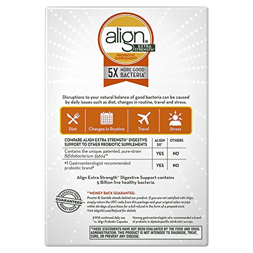 Align Extra Strength is a daily probiotic supplement that fortifies your digestive system with healthy bacteria* -- with 5X more good bacteria than in regular Align. In fact, Align is the #1 doctor and gastroenterologist recommended probiotic brand. Align contains Bifidobacterium 35624, a unique and patented probiotic strain. Keep your digestive system in sync* with Align Extra Strength, so you can continue doing the things you love to do.Feature