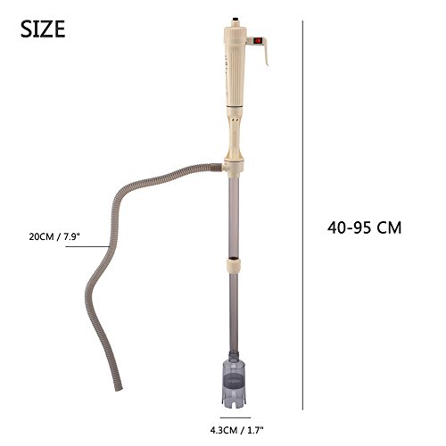 Specifications: Type: Aquarium Battery Cleaner Material: Plastic Mode: ON/ OFF Powered by: 2* 1.5V battery (Not Included) or DC 3V 500mA adaptor (Not Included) Water Level: 20 -75 cm / 7.9-30" Flow rate: 520 l/H Product Length: 40-95 cm Inlet tube: 20cm / 7.9" Extension tube: 40cm / 15.8" Extension tube: 18cm / 7.1" Item Size: 30*7.6*4.3cm / 11.8*3*1.7"(L*W*H) Net Weight: 256g / 9oz