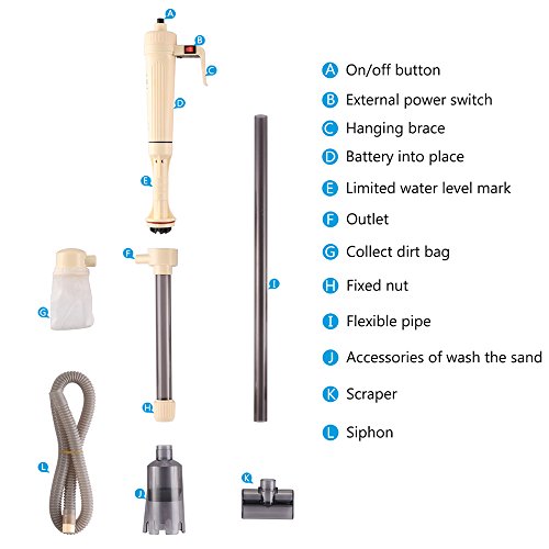 Package Included: 1* Aquarium Battery Cleaner 1* Inlet Tube 2* Extension Tube 1* Scraper 1* Accessories of Sand-Washing 1* Collect Dirt Bag 1* Siphon