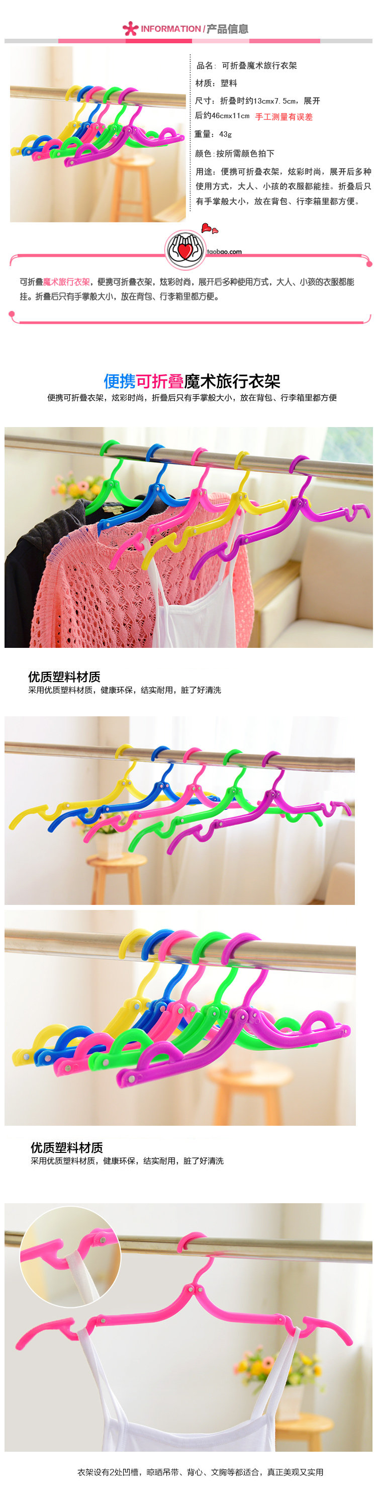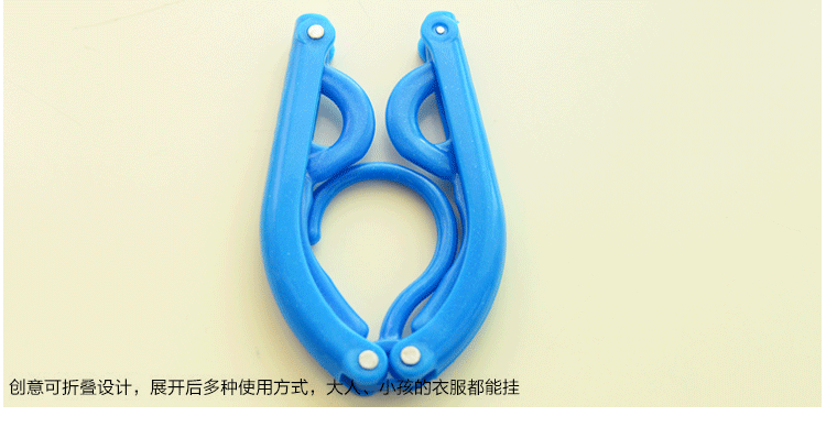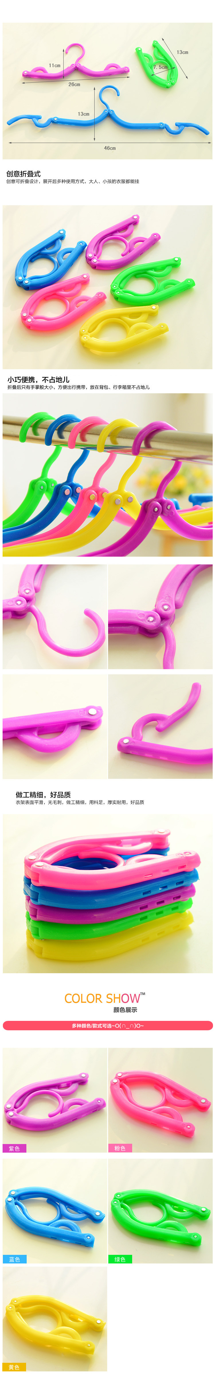 便携可折叠衣架,炫彩时尚,展开后多种使用方式,大人、小孩的衣服都能挂。折叠后只有手掌般大小,放在背包、行李箱里都方便。品牌: jimei材质: 塑料货号: 3877颜色分类: 6179