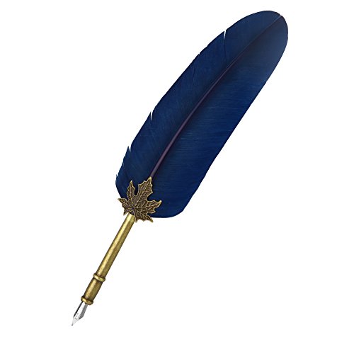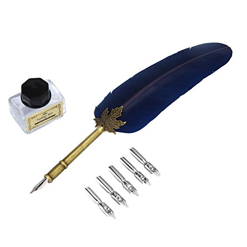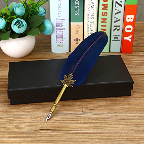 Feather Dip Pen Set Antique Feather Copper Pen Stem Calligraphy Quill Pen Writing Quill Ink Dip Pen With 5pcs Nibs in Different Size(Navy)