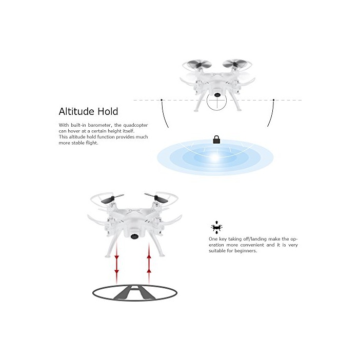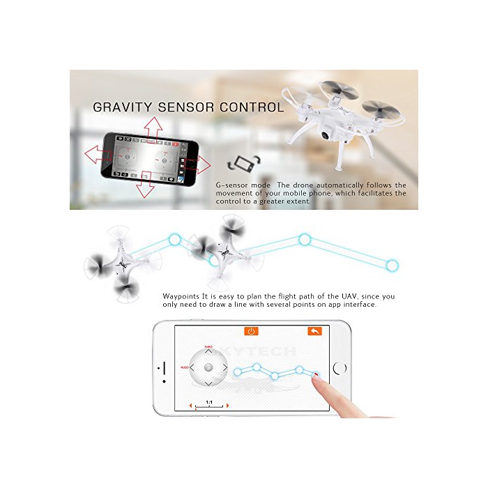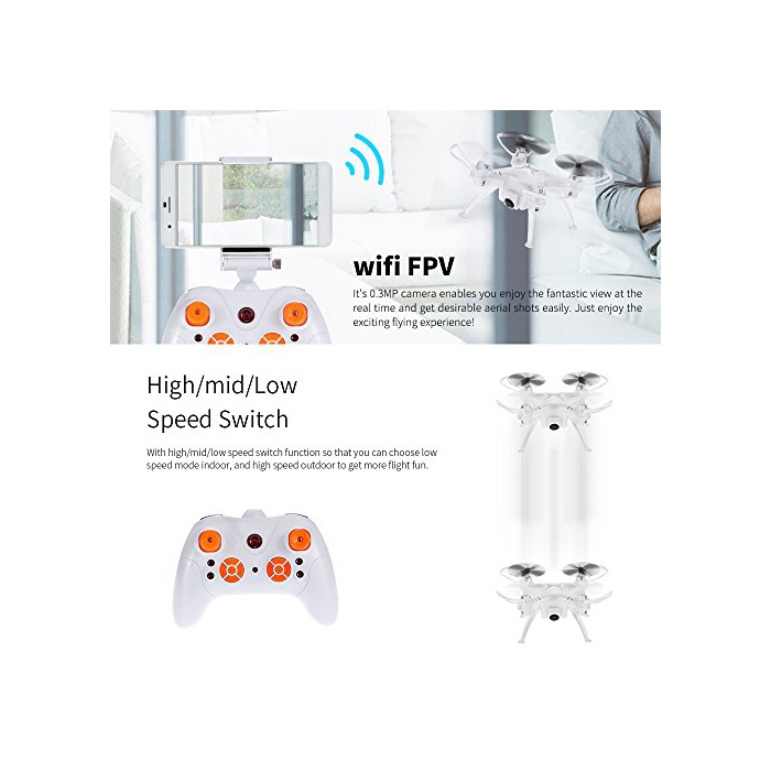헤드 레스 모드:비행하기 전에 항공기의 위치를 조정하는 필요는 없습니다. 중력 센서 모드:무인기는 휴대폰의 움직임에 자동적으로 추종하고, 제어가 용이 입니다.