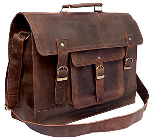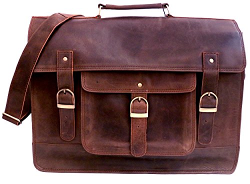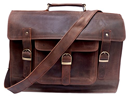 -. Feature : Full grain Crazy-Horse Genuine Cow Leather, 100% Brand New & High Quality, / 1 front big pocket, 2 inner compartment and 2 zipper pocket / Dimensions: 18 inches (length), 13 inches (height), 6 inches (depth) / Strong & durable brass fittings & buckles, quality zippers, heavy duty suede lining on flap and cotton lining inside / Closure: Snaps Hidden under Buckle, Adjustable shoulder strap and hand carry