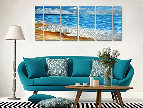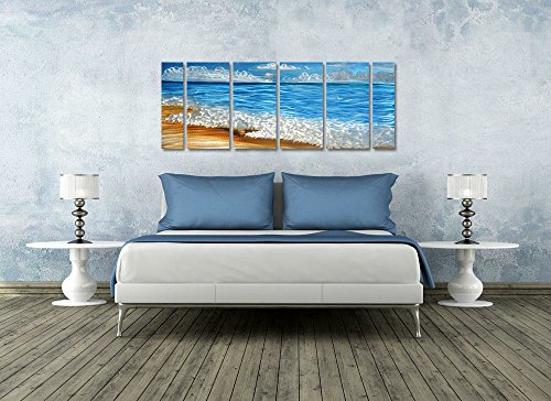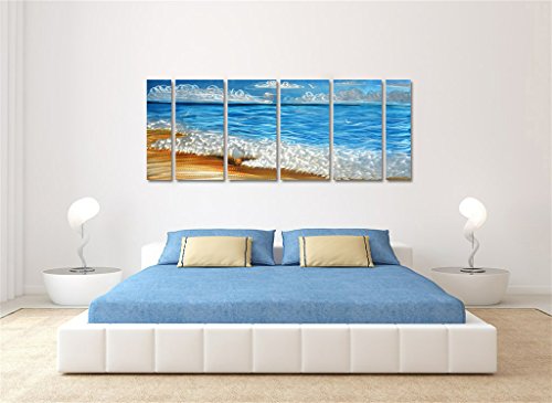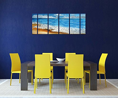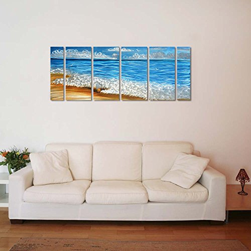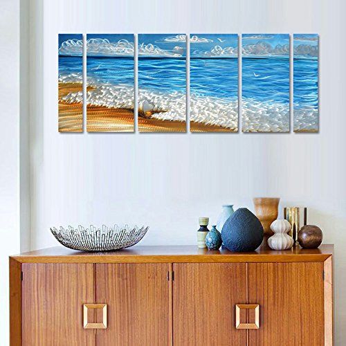 Handmade Metal Wall Art with Blue Ocean, Excellent Holiday Beach Design Wall Sculpture, 3D Metal Art for Home and Hotel Decor, Modern Landscape Set of 6-Panels Measures 24" x 65"