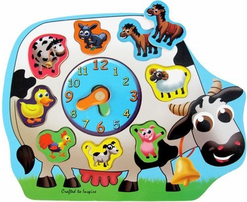 Colorful Natural Wood Raised Puzzles Clock "Farm Animals" - Educational Toy For Children Age 3+. A fun and educational toy. Consists of 8 animal puzzles and a clock board - all made from natural wood. Measures 12" L x 9" W. Recommended children age 3+. Kid Safe: Conforms to USA safety standards. This is not a functional clock - there are no mechanical parts or battery.Feature