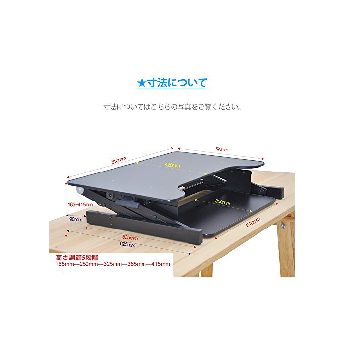 (책상이나 카운터의) 널찍하고 평평한 윗부분810×520mm 허용 중량:상하 운동을 가미하면 15kg전후,상하 운동을 가미 하지 않는 경우는 40kg까지 가능.standing 데스크를 두는 데스크의 권장 넓음:(세로)62.5cm×(옆)81cm이상 높이는 5단계에 조절 를 할 수 있습니다.안정성도 완벽입니다.