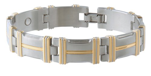 ReleaseDate : 2008-01-25 Studio : Sabona Publisher : Sabona Binding : Health and Beauty Product Description A Hugh Weaver design, this bracelet with brushed stainless steel and 18k gold plating and some interesting lines is a classy upscale look that is sure to draw attention. A 1200 gauss samarium cobalt magnet is in each large link. 0