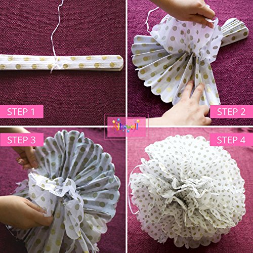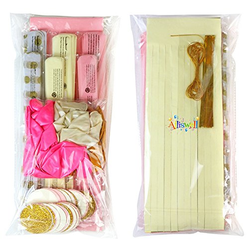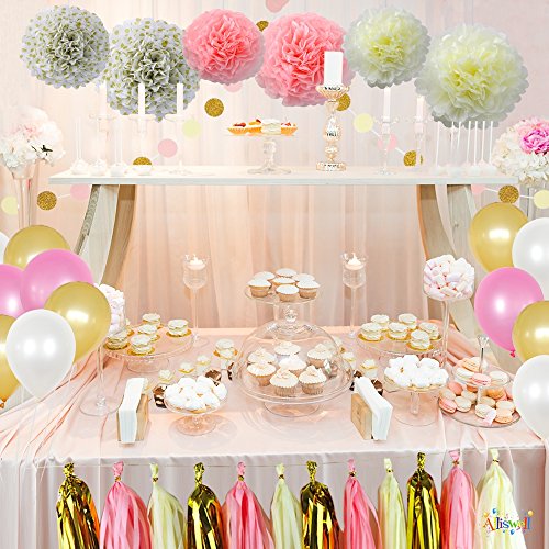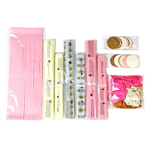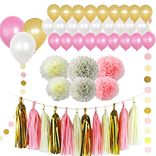 - ✔ BEAUTIFUL COLORS AND PERFECT SIZES - The paper pom poms that are included come in 3 different colors and 2 different sizes for each color; 2 baby pink (1*10in, 1*12in), 2 cream (1*10in, 1*12in), 2 white with golden polka dots (1*10in, 1*12in). The paper tassel garland comes with 12 pieces with 4 sets of 3 different colors; (4 baby pink, 4 cream, and 4 glitter gold). The 2 packs of circle garlands are both 6 ½ ft long. Bonus 30 12” Latex balloons which come in, 10 pink, 10 white, and 10 golden.