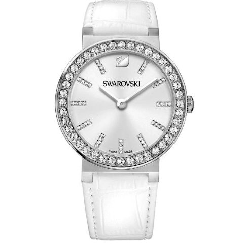 -. Title : Swarovski Citra Spehere Silver Dial Stainless Steel Crystal Case White Leather Ladies Watch 1185826